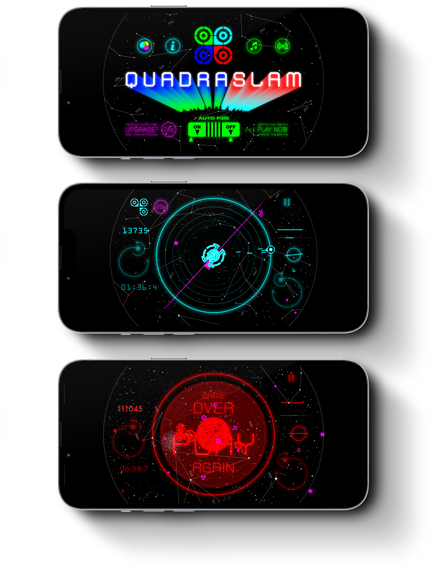 Quadraslam is a space shooter game that uses colours to control the weapons. When aliens of a certain colour appear the weapons systems power up, add the colour to attack those ships. The HUD interface shows the colour of a special shields the aliens have allowing them to be shot down in a single shot. The interface is a rotational system. There’s shields and four incredibly difficult stages to complete. The galaxies behind the hud rotate and the music thumps as you are pelted with return fire, it’s full-on.